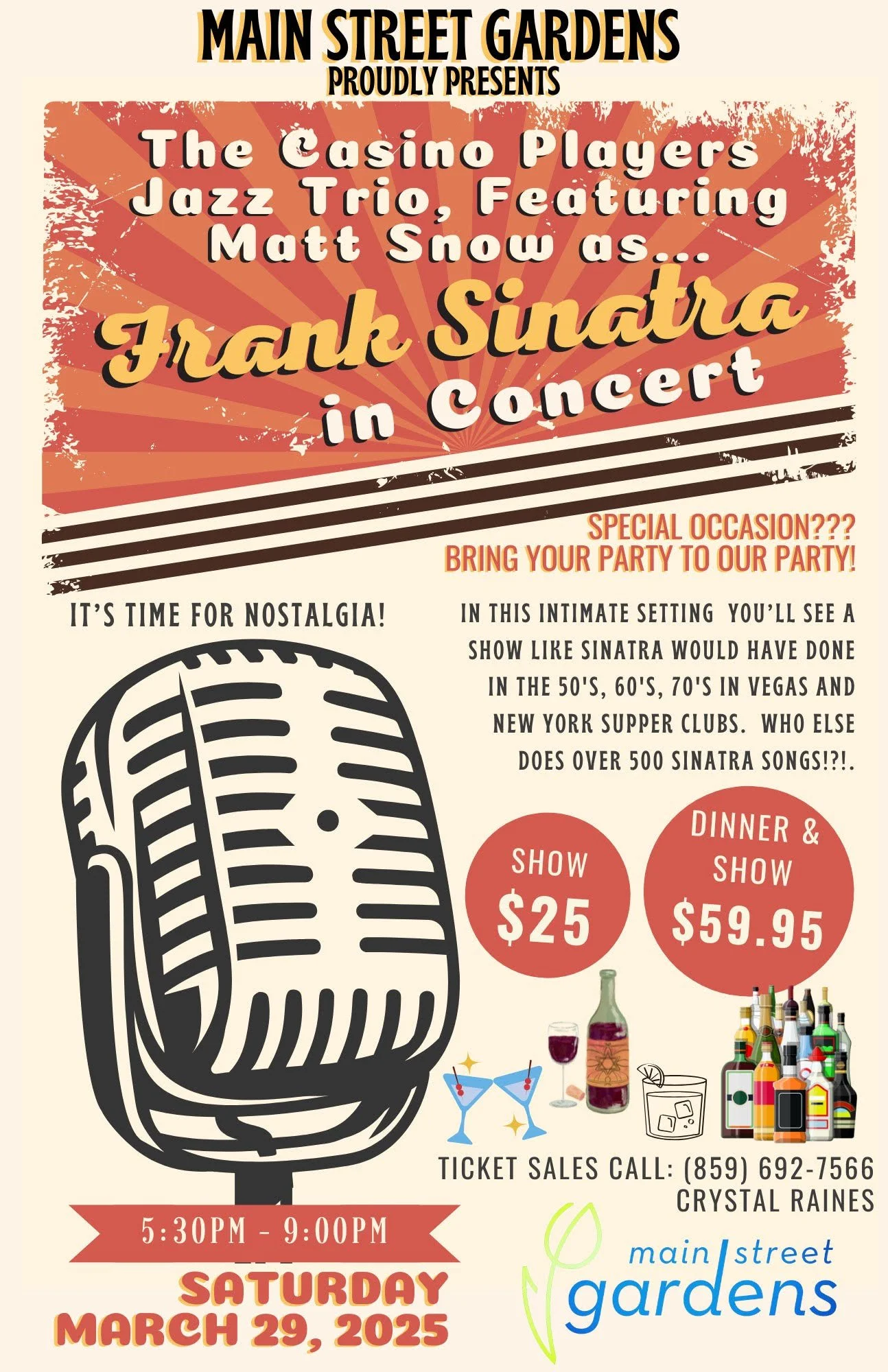 In this intimate setting, you’ll see a show like Sinatra would have done in the 50’s, 60’s, and 70’s in Vegas and New York Supper Clubs.